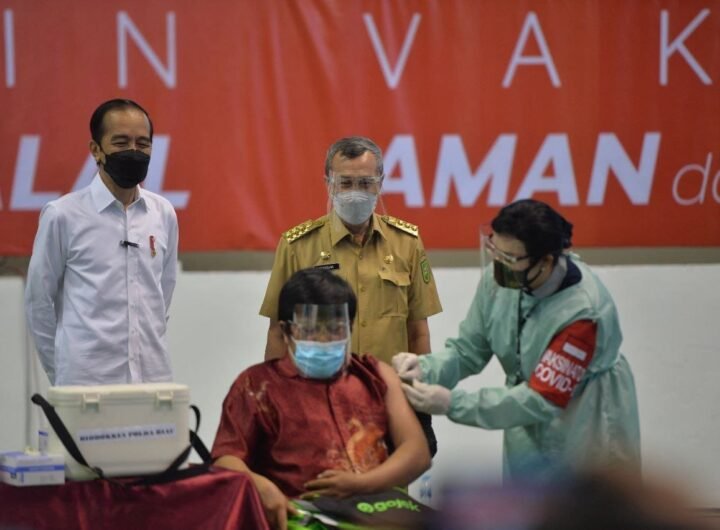 Presiden RI, Joko Widodo bersama Gubernur Riau, Drs H Syamsuar MSi meninjau pelaksanaan vaksinasi covid-19 di Pekanbaru....