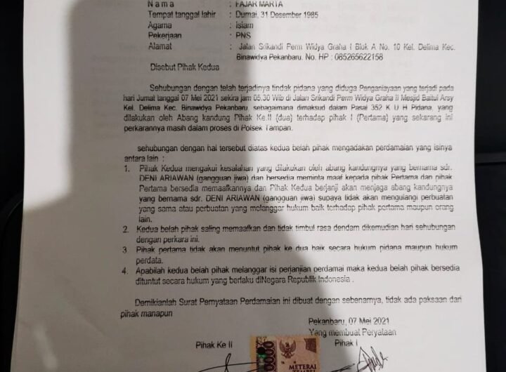Surat perdamaian kasus penganiayaan imam Masjid Baitul Ar’sy antara pelaku dan korban. PEKANBARU (perepat.com)-Kasus penganiayaan imam sholat...