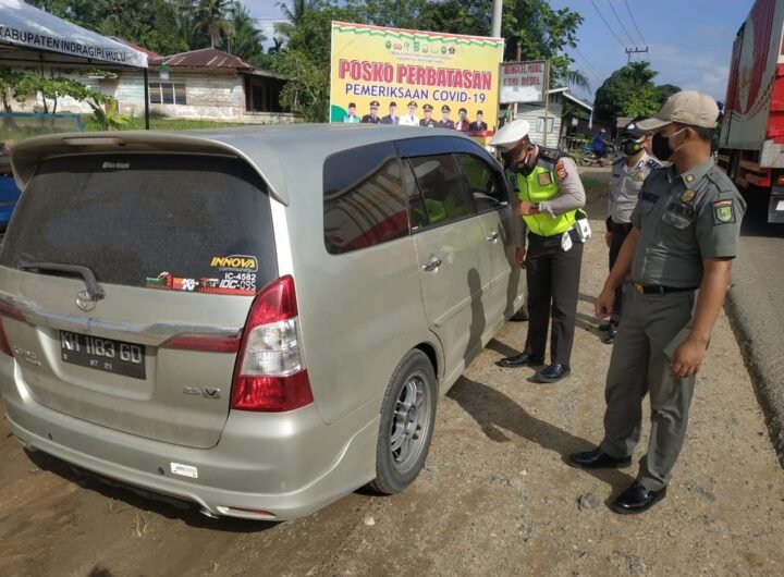 Satpol PP Inhu bersama TNI/Polri melakukan pemeriksaan kendaraan di posko penyekatan pintu masuk perbatasan Inhu. INHU (perepat.com)-Antisipasi...