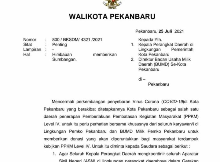 Surat imbauan agar ASN di Kota Pekanbaru Sumbangkan Gaji untuk bantu masyarakat. PEKANBARU (perepat.com)-Pemberlakuan Pembatasan Kegiatan Masyarakat...