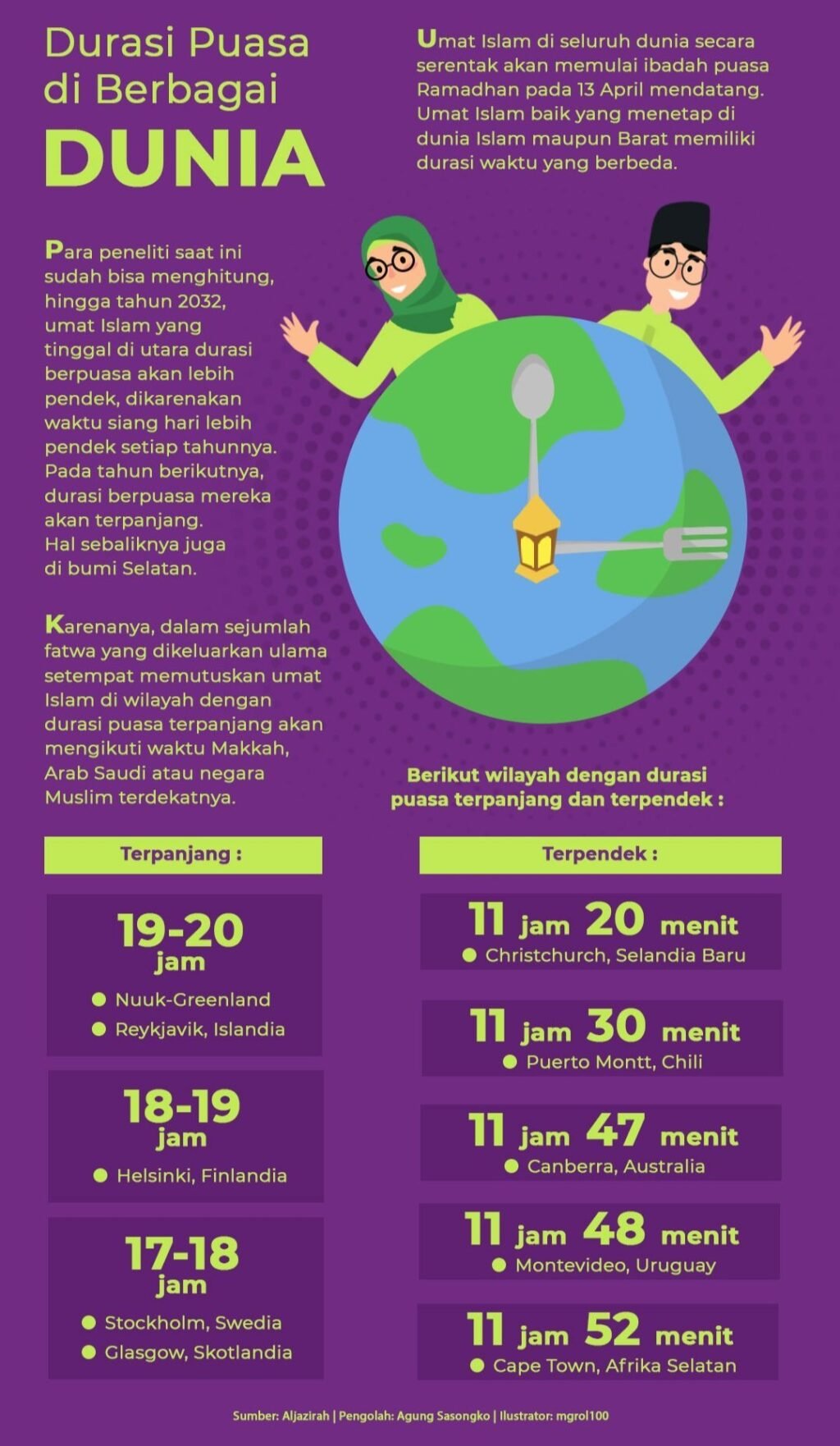 1) Uni Emirat Arab (UEA): Anggota Badan Ilmu Astronomi dan Luar Angkasa UEA, Ibrahim Al Jarwan, menyatakan awal Romadhon in sya’a Allaah pada Selasa 13 April 2021. ‘Id al-Fithry 1 Syawal 1422 diperkirakan Kamis 13 Mei.