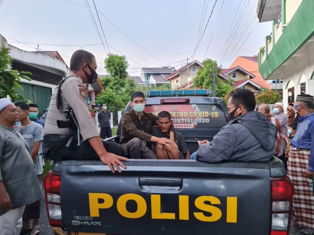 Pelaku penganiayaan terhadap imam Sholat Subuh di Masjid Baitul Ar’sy diamankan warga dan aparat kepolisian.(foto istimewa)