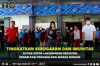 Senam pagi dilaksanakan di Gazebo Gedung I Rutan Kelas I Depok, kegiatan senam berlangsung dengan menjaga protokol kesehatan, menjaga jarak aman antar peserta senam.
