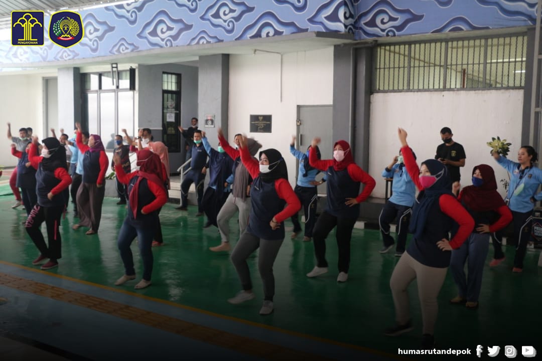 Senam pagi dilaksanakan di Gazebo Gedung I Rutan Kelas I Depok, kegiatan senam berlangsung dengan menjaga protokol kesehatan, menjaga jarak aman antar peserta senam.