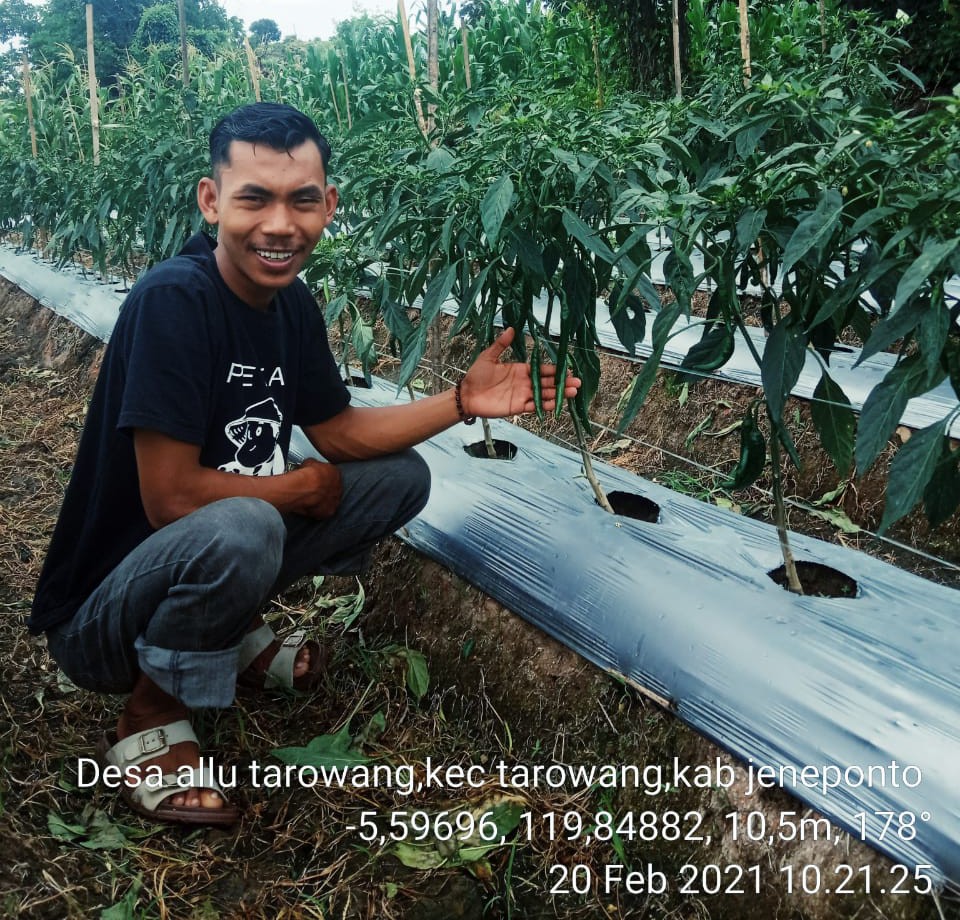 | Gustiranda berpose di sekitar tanaman cabe yang ia kelola sendiri |