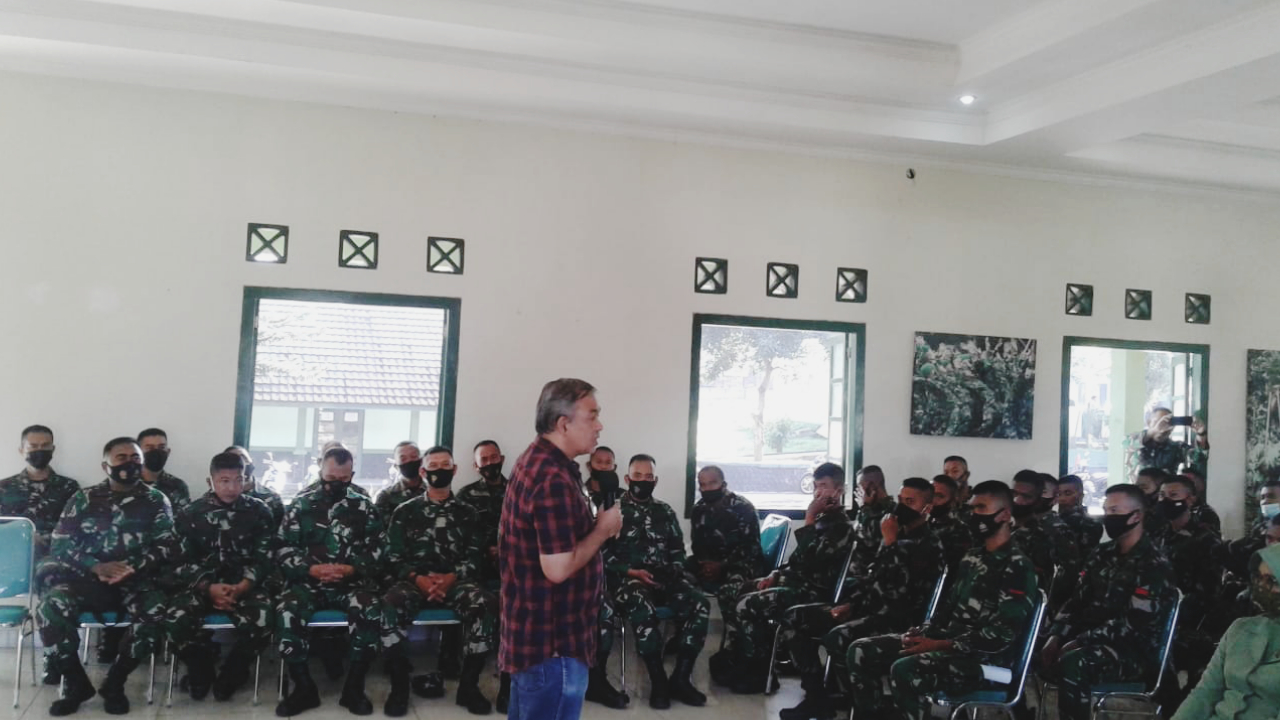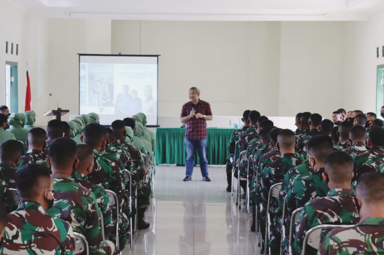 | Dr Aqua Dwipayana di depan para prajurit TNI pada saat menyampaikan materi Komunikasi lintas budaya |