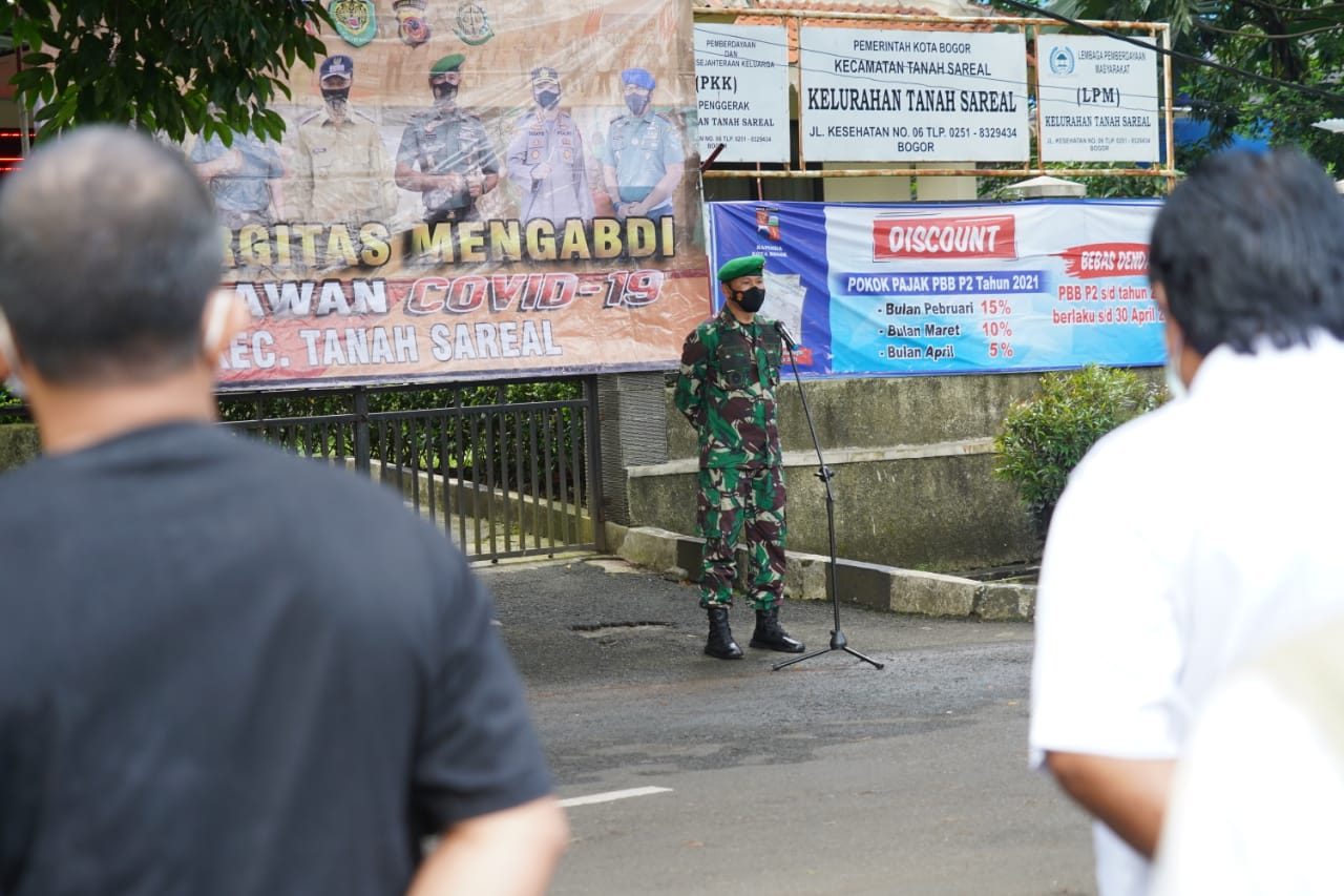 Kasi Op Korem 061/Sk ( Letkol Inf Sigit Purwanto) bersama, Sahib Khan, S.STP.,M.PA (Camat Tanah Sareal), Kapten Inf Heru Susilo (Danramil Tanah Sareal) Kompol Indrianingtyas HP, SH (Kapolsek Tanah Sareal), Kompol Otang (Kasat Shabara Polresta Bogor), dan diikuti oleh para Lurah Se – Tanah Sareal Kota Bogor, serta Kasi Trantib Se – Kec. Tanah Sareal, serta Unsur Yang Terlibat Dalam Apel adalah Koramil Tanah Sareal, Polsek Tanah Sareal, Bhabinsa dan Bhabinkamtibmas Se – Tanah Sareal, Satpol PP Kota Bogor, Danrem langsung mengunjungi warga masyarakat sekitar yang tengah menjalani isolasi mandiri akibat terpapar virus covid-19.