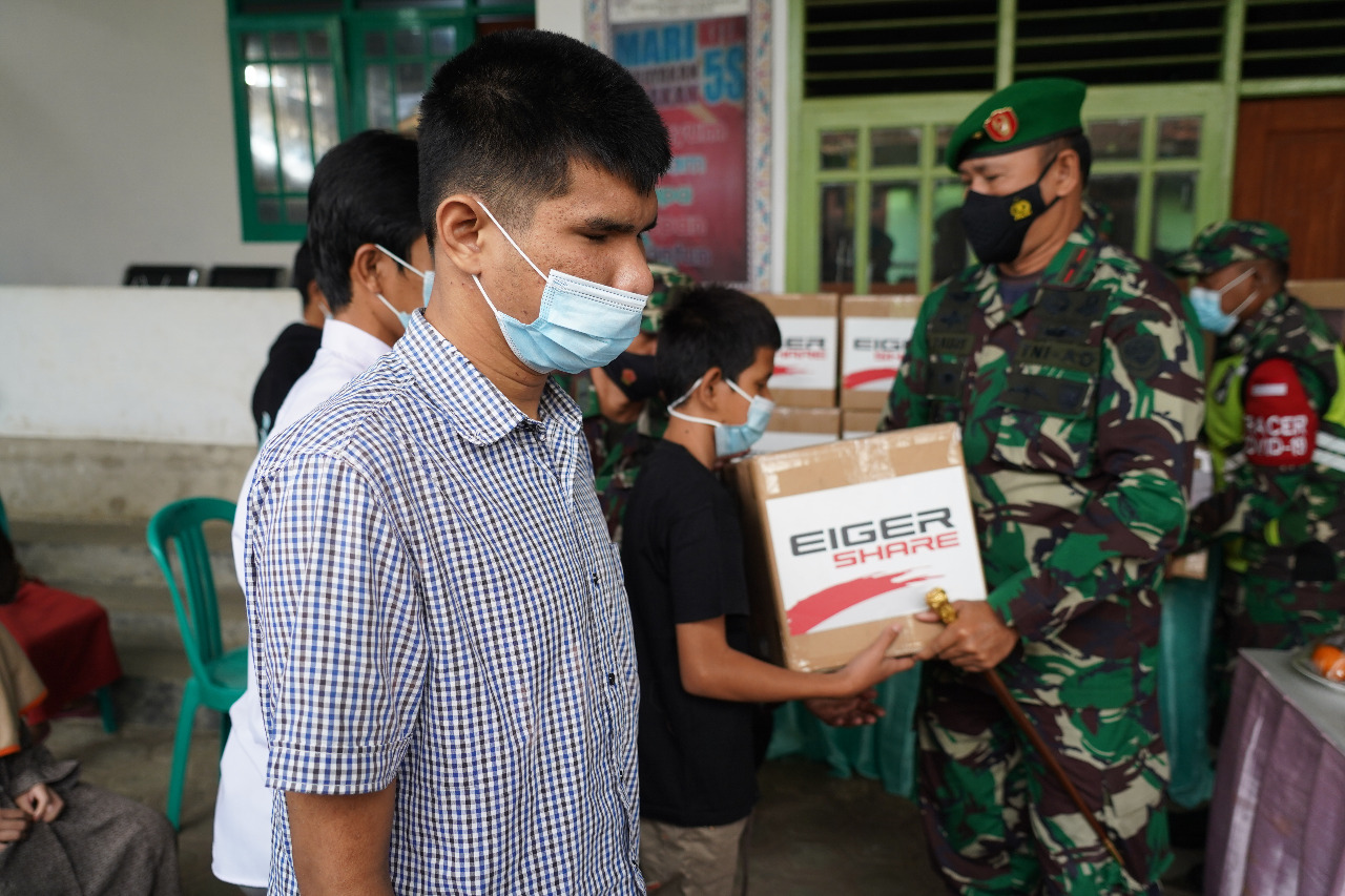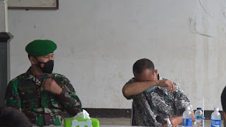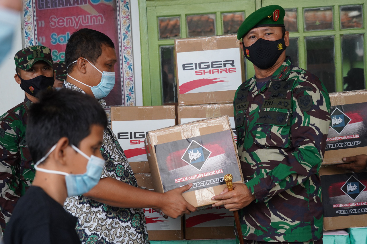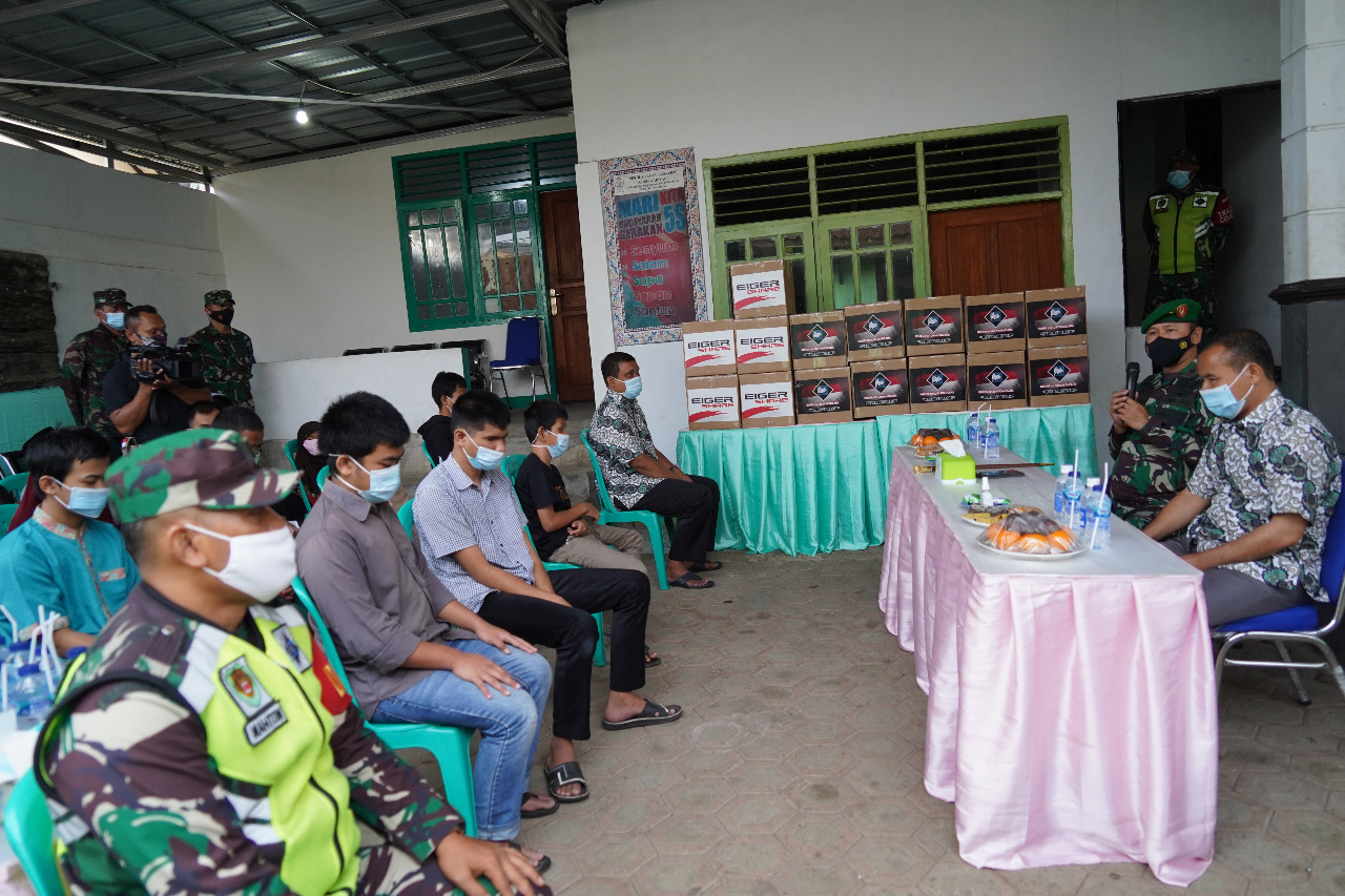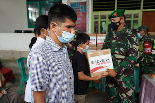 Usai memberikan arahan atau himbauan, Danrem menyerahkan paket bantuan sembako pada hari ini sebanyak 269 paket, selain itu ada Hand sanitizer, masker dan juga santunan tali asih.