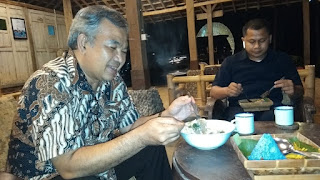 Udara sejuk. Sajian teh tudung dan mie lethek godog yang panas membuat suasana menjadi begitu pas. Berkali-kali Dr Aqua mengatakan masakannya enak dan suasananya pas banget. “Enak sekali ini Mas Erwan. Suasana dan makanannya. Udara sejuk. Pas ini, minumnya teh panas dan makannya bakmi rebus panas. Murah lagi.”