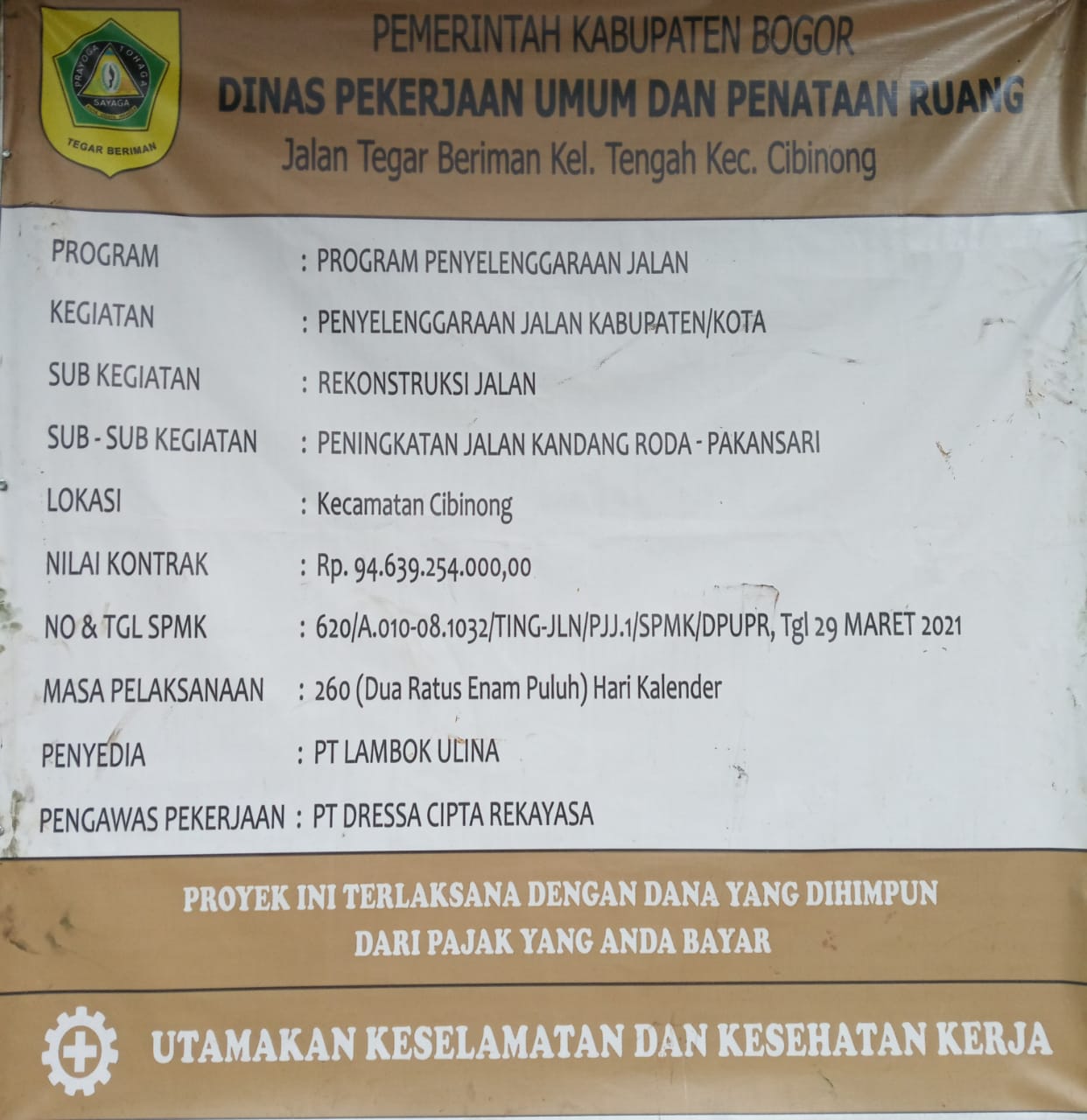 Paparan.net | Bogor Kab – Pemenang lelang Proyek peningkatan Jalan Kandang Roda-Pakansari senilai Rp94 miliar tersebut Bagian Pengadaan Barang Jasa Setda Kabupaten Bogor menentukan PT Lambok Ulina sebagai pemenang lelang proyek melaksanakan pekerjaan sesuai dengan hone scedule.